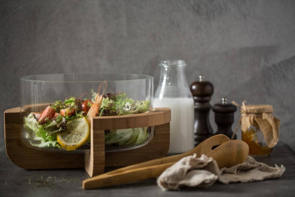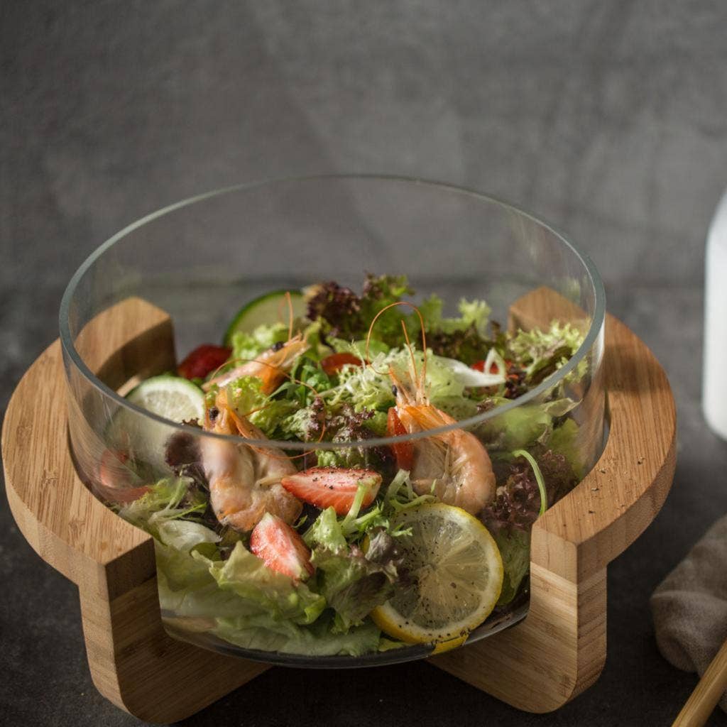 • Materiales: Ensaladera de cristal transparente, Soporte de madera