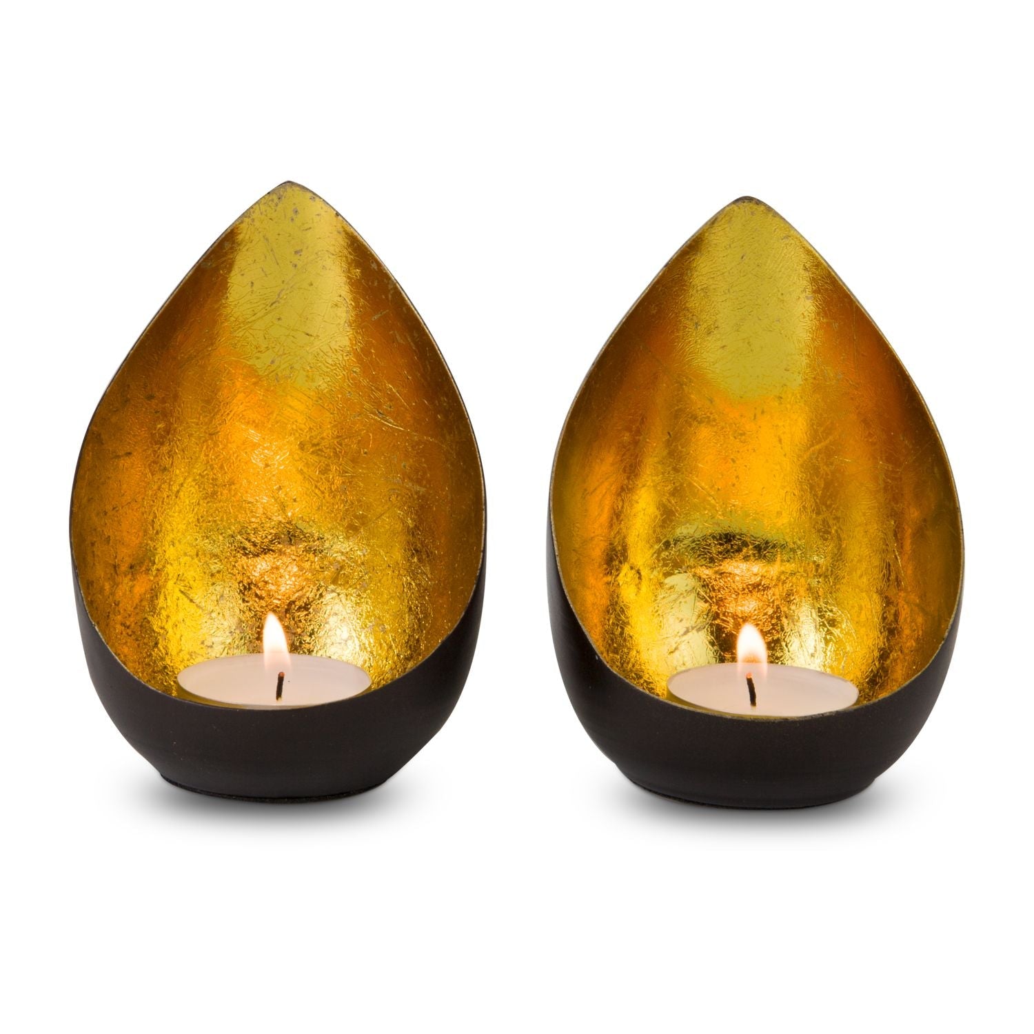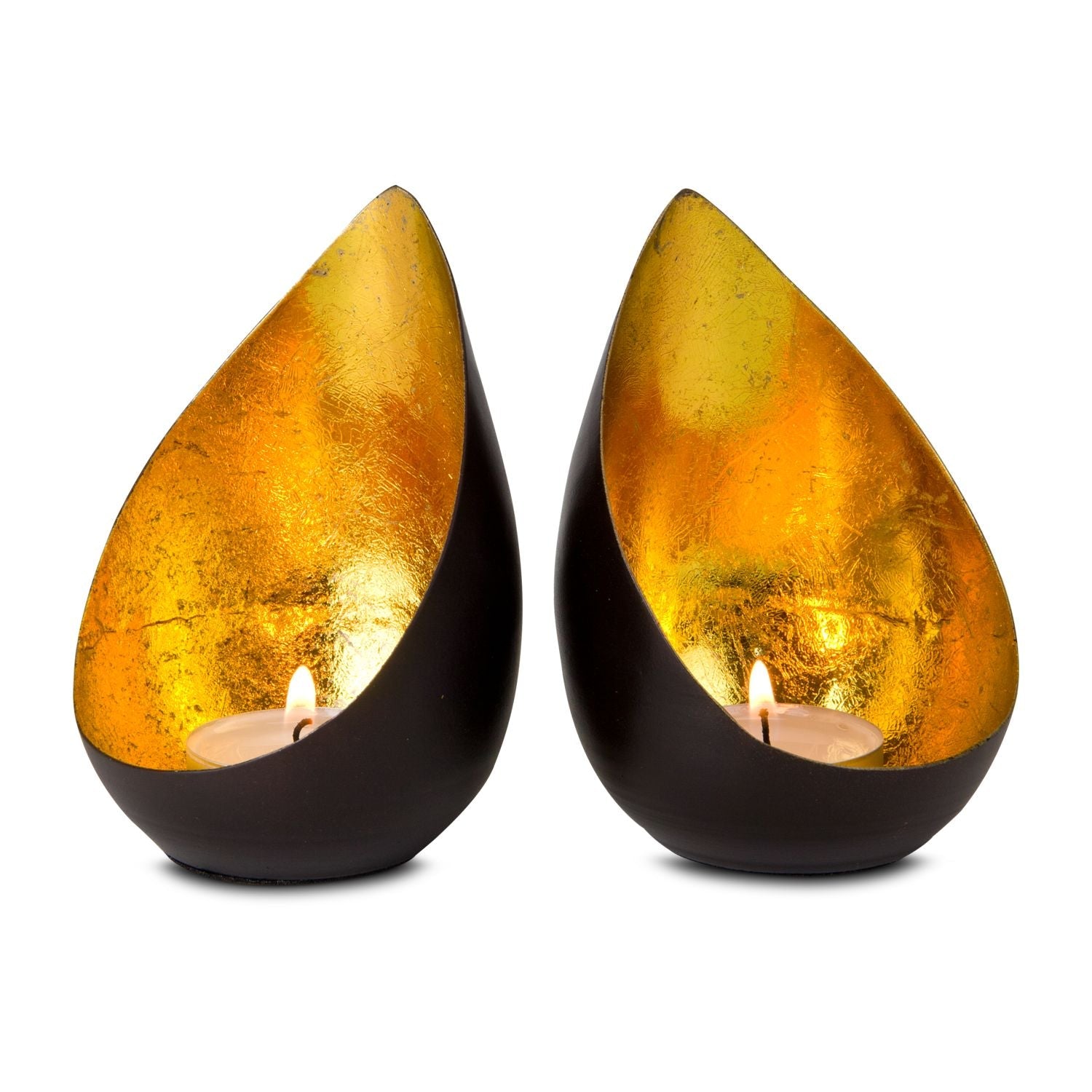 Dos magníficos portavelas decorativos que forman un conjunto armonioso, efectos de luz dorada para una relajación pura. El trabajo manual provoca ligeras diferencias de forma. También disponible en otros modelos.