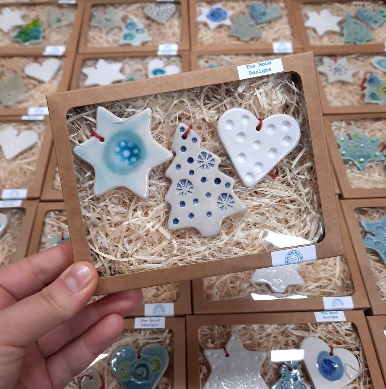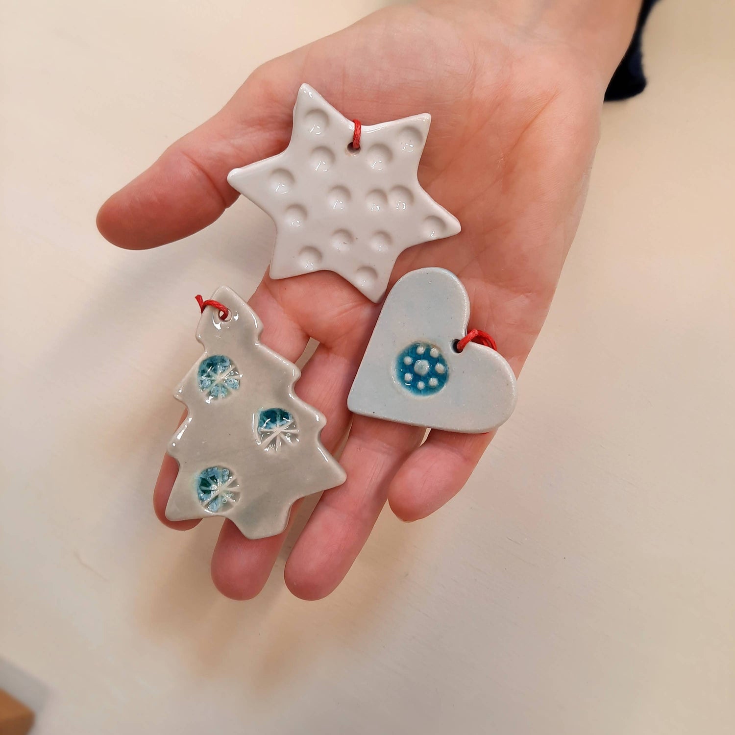 Agregue un toque de encanto artesanal a su decoración navideña con nuestro juego de 3 adornos de terracota surtidos. Cada pieza es ligeramente diferente, lo que las hace únicas. Las paletas de colores incluyen blanco, gris, verde y azul, con un cordón de algodón encerado adjunto para colgarlo fácilmente.