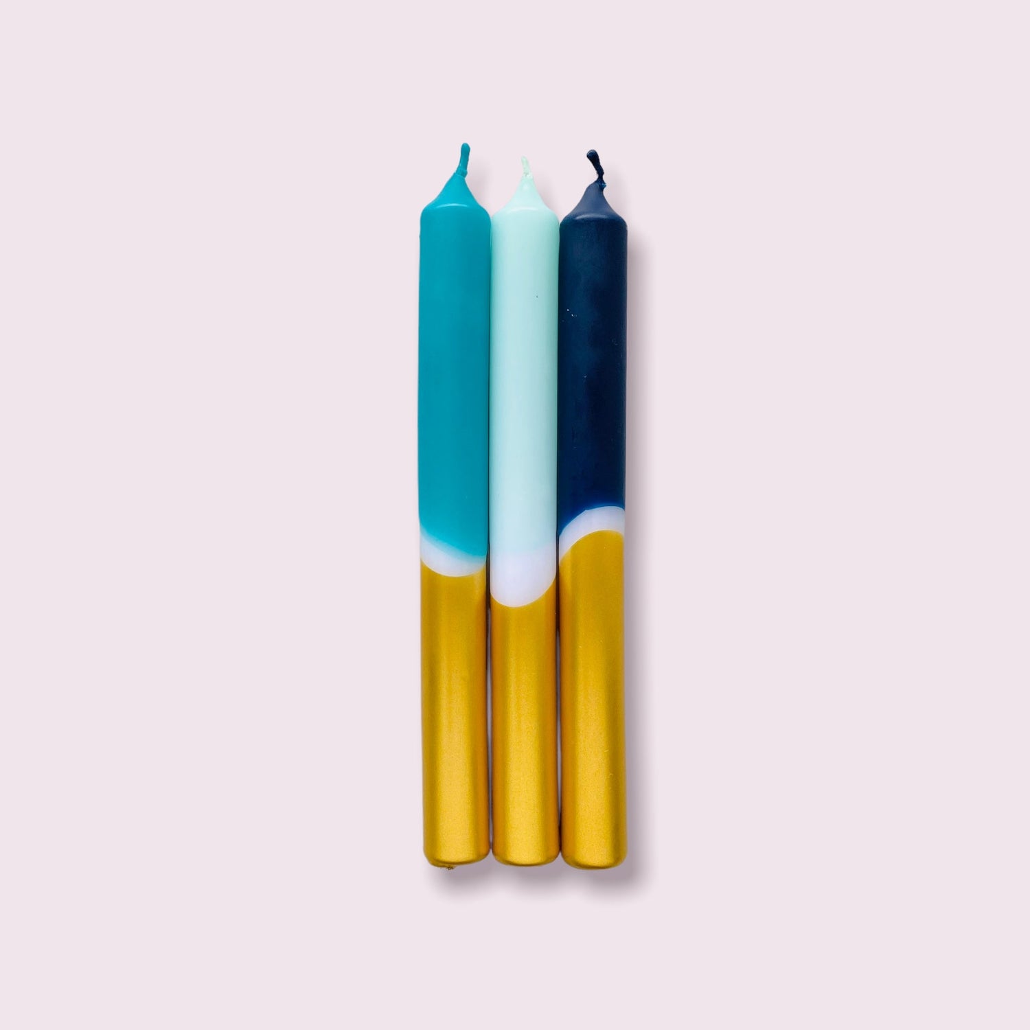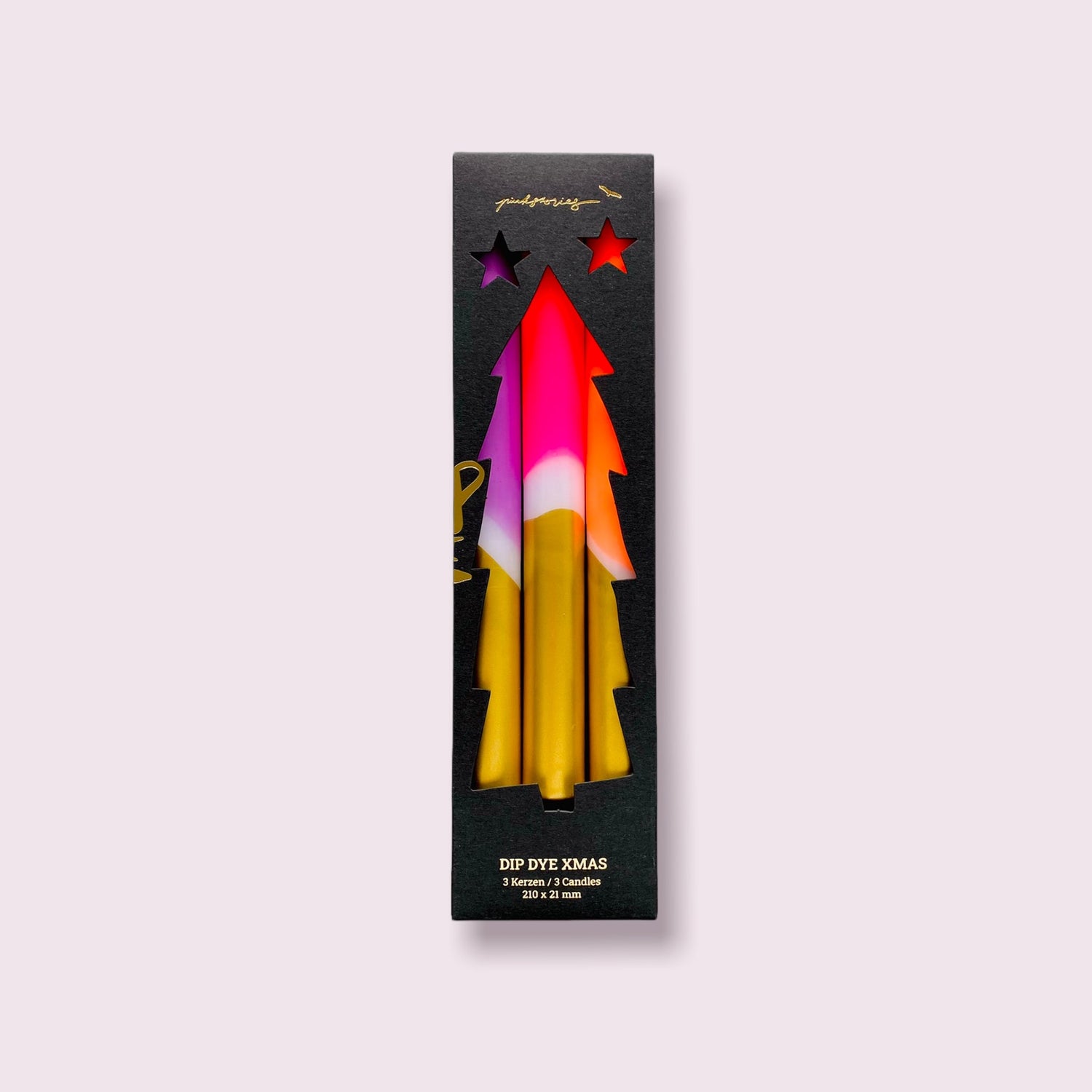 Juego de tres velas para cenar empaquetadas en una caja navideña de alta calidad con relieve metálico.