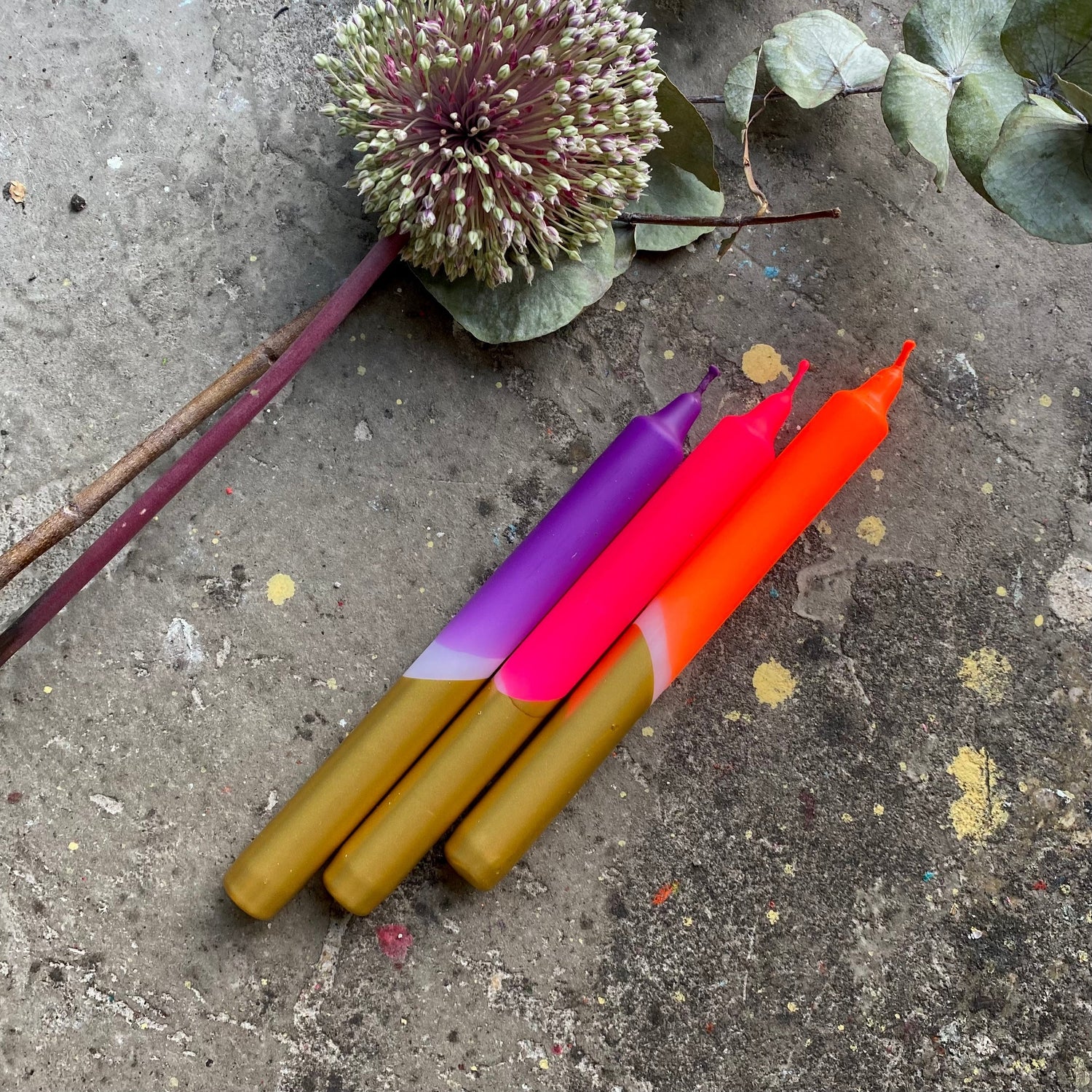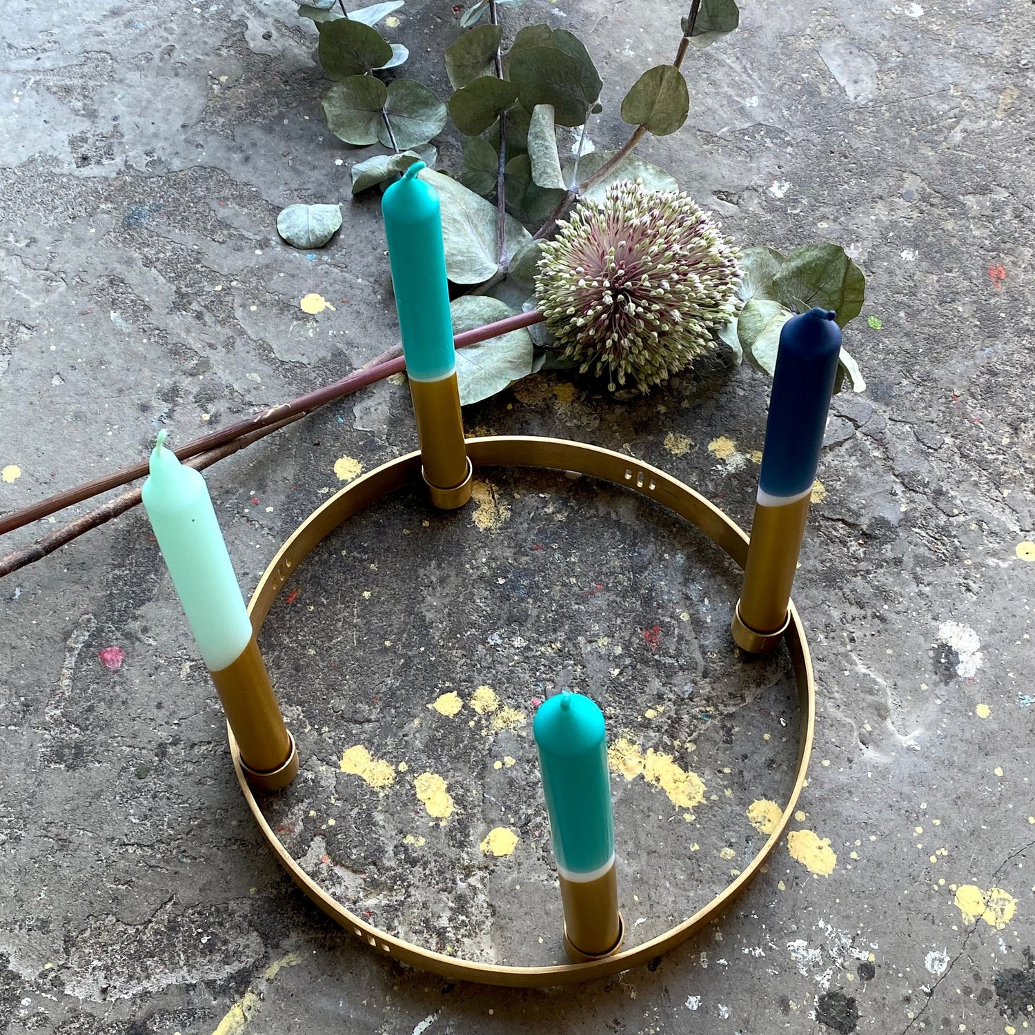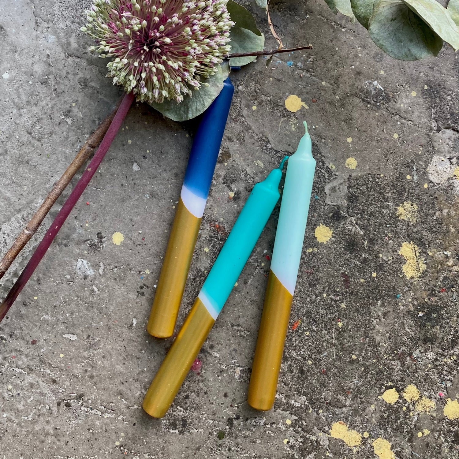 Hermosas velas de mesa con apariencia dorada, hechas de parafina cuidadosamente seleccionada. Hecho a mano en las pintorescas estribaciones de los Alpes bávaros. Debido al trabajo manual, los patrones pueden variar y hacerlos únicos.